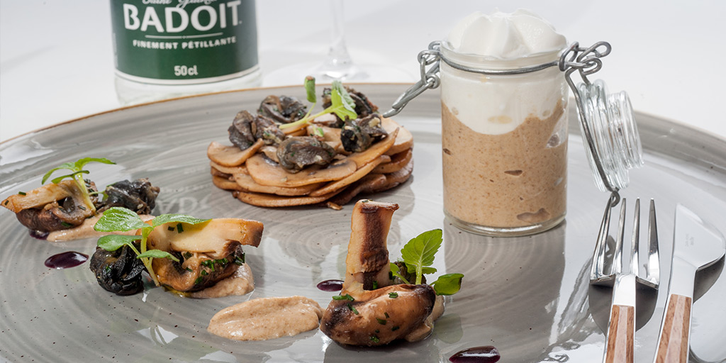 - Au centre de l’assiette, disposez du velouté de champignon et associez les escargots et la poêlée de champignons.