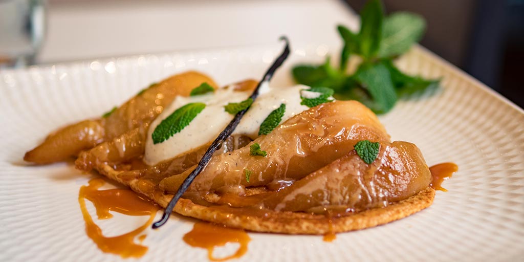 - Disposer les tranches de poires sur l’Arlette et napper de sauce au beurre salé.