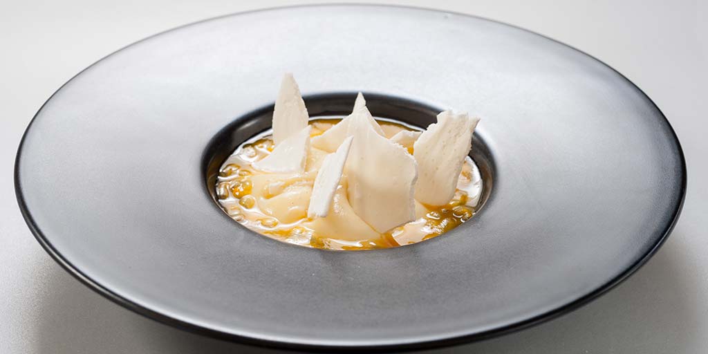 - Dressage: pochez la crème pâtissière au chocolat blanc au centre de l’assiette, ouvrez un fruit de la passion, mettez-le autour de la crème et plantez les éclats de meringues dans la crème.
