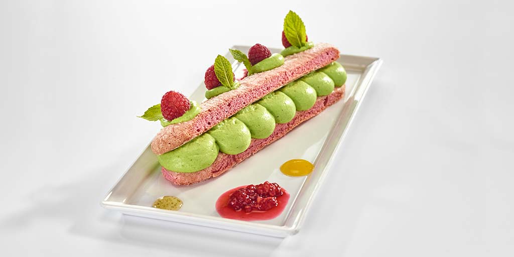 - Dans une assiette plate, déposer un biscuit rose puis à l’aide de la poche à douille disposer des gros points de crème à la pistache.