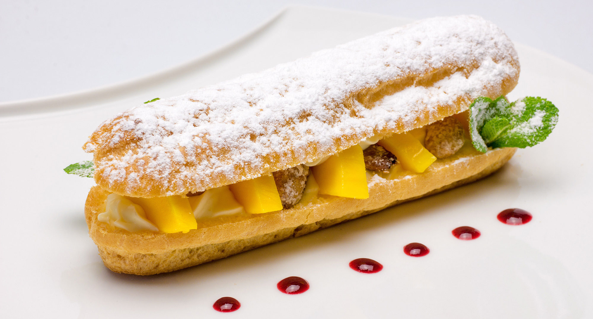 Recette d’Eclair à la crème de chocolat blanc, mangue, amandes et noisettes caramélisées