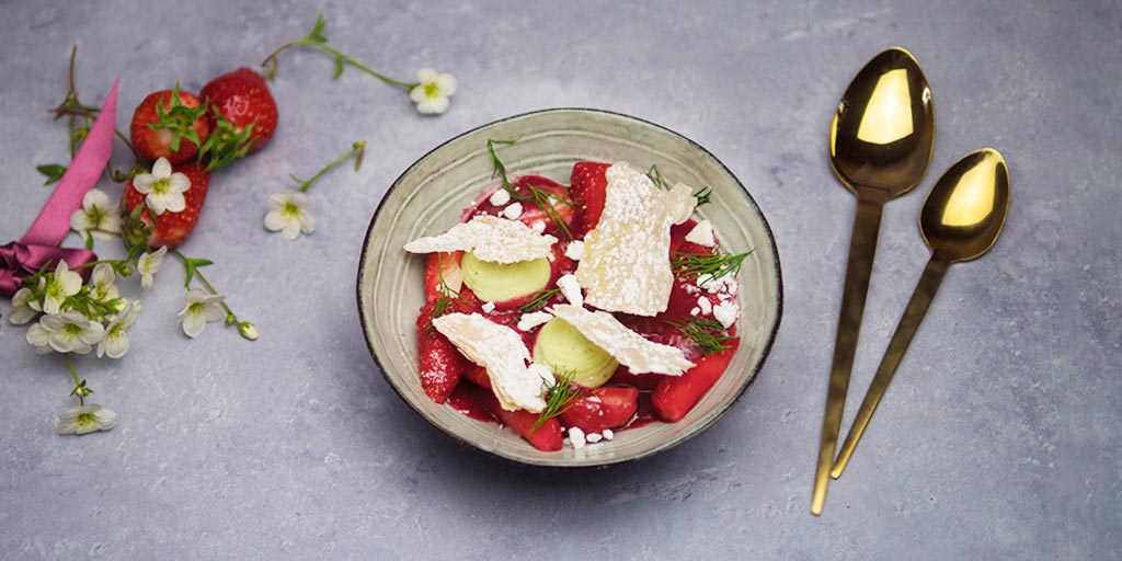 - Disposer les fraises au sirop équitablement dans chaque bol et en garder pour terminer le dressage.