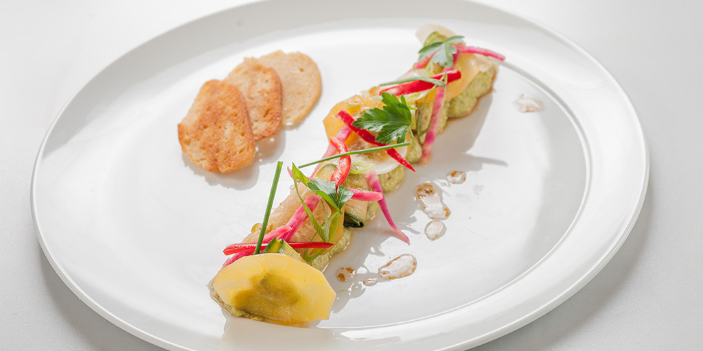 Quel talent, une assiette structurée et harmonieuse ! Ces couleurs d’été seront accompagnées d’un Chardonnay 2014 de chez Joseph Drouin aux notes d’arômes « miel et citron ». Sa rondeur et sa fraîcheur viendront équilibrer la texture de l’avocat et les légumes en pickles. Un vin « plein de vie » et un chef « heureux », bonne dégustation !