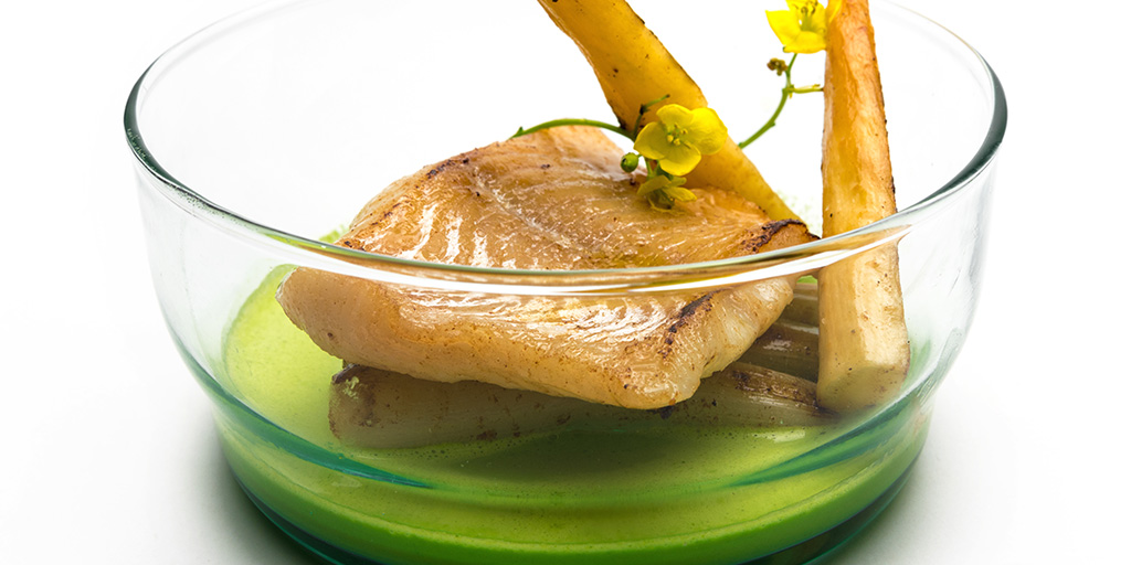 - Préparation la veille : faites chauffer le lait jusqu’à frémissement, incorporez le haddock. Laissez infuser pendant 30 minutes hors du feu, puis filmez. Retirez le haddock et plongez le lieu jaune. Réservez les poissons au frais. Faites cuire les panais en papillotes, avec de l’huile d’olive, la muscade et sel. Mettez au four pendant 40 minutes, à 160 °C. Coupez les panais en long. Ensuite, blanchissez le cresson dans l’eau bouillante pendant 2 minutes et faites refroidir à l’eau glacée pour fixer la chlorophylle. Blanchissez les poireaux dans une poêle, et poêlez-les au beurre.