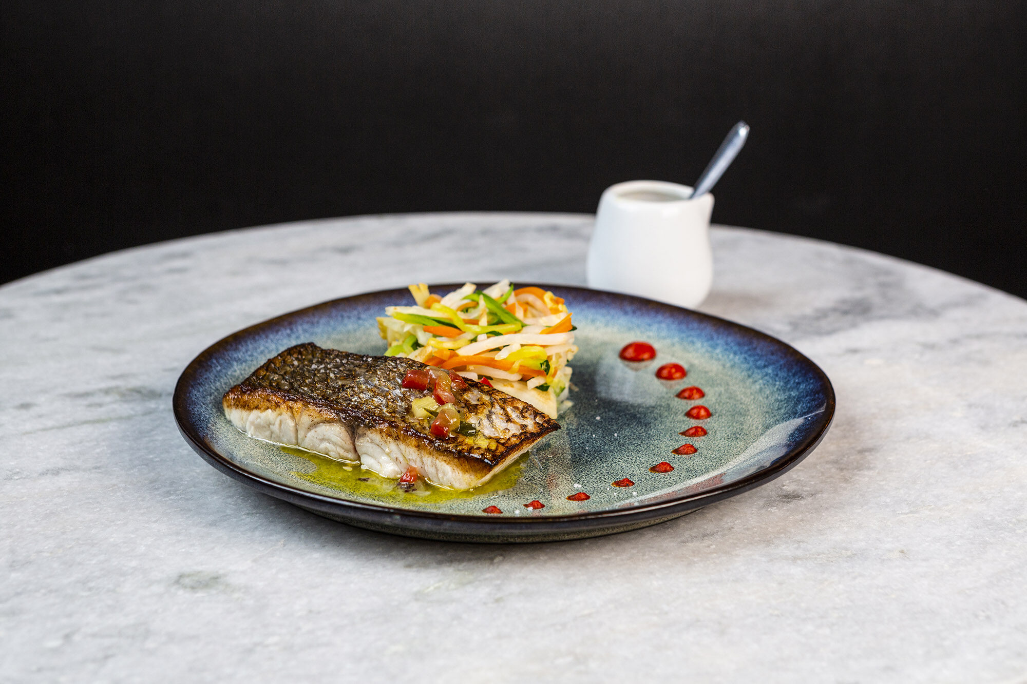 Au centre de l’assiette, dressez harmonieusement les légumes et posez le pavé de maigre à côté. Accompagnez avec la sauce vierge.