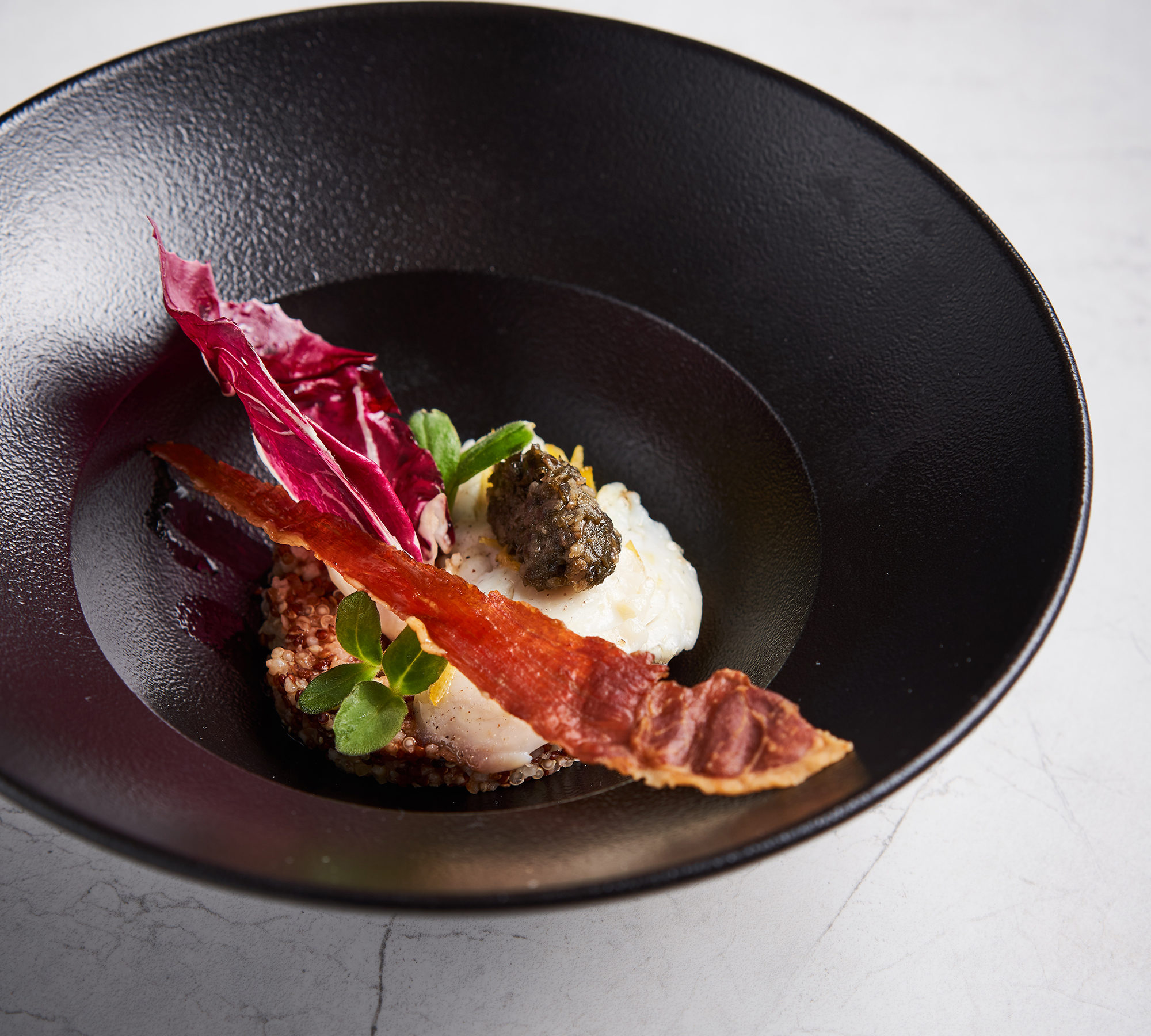 Faites mariner les pétales de daurade avec l’échalote, le gingembre, la coriandre, le jus de citron vert, un filet d’huile d’olive, du sel et du poivre.